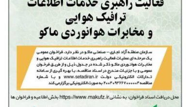 آگهی فراخوان عمومی تجدید شده «فعالیت راهبری خدمات اطلاعات ترافیک هوایی و مخابرات هوانوردی ماکو